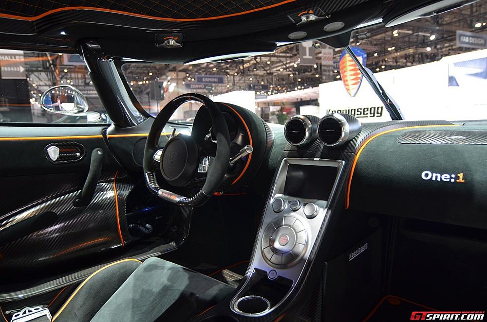 Predominanttly black alcantara, with bare carbon accents. Minimal leather, notably on upper door panel sections. Orange pinstripe accents on dashboard, roof and rear bulkhead. Aluminum console center section. One:1-specific seats, passenger airbag. The rear bulkhead features the famous ghost logo, displaced from the nonexistent rear window.