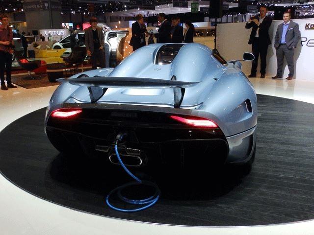 As a plug-in hybrid, the charge connector for the batteries resides behind a motorized license plate holder. The exhaust for the internal combustion engine exits through fin shaped aperatures in the rear diffuser; what appears to be an exhaust outlet is actually a cooling duct for the electric drivetrain components. The new headlight assemblies incorporate "constellation" style Daytime Running Lights (DRLs), and entirely new taillights are seen as well. The third brake light illuminates as the word "Koenigsegg".